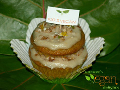 NATURE'S Double Decker Carrot Almond Coconut Cupcake.....Made with organic spelt flour, vanilla bean, organic almond extract, organic raw almonds, organic coconut shreds, organic coconut oil, baking soda, baking powder, organic carrots, lemon zest and juice, organic cashews, coconut palm sugar, edible wild guava flowers |