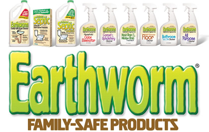EARTHWORM® Family-Safe Products include a Drain Cleaner, All Purpose Cleaner, Multi-Purpose Floor Cleaner, Carpet & Upholstery Cleaner, Mold & Mildew Stain Treatment, Bathroom Tub & Tile Cleaner, Household Odor Eliminator, Septic System Treatment and Liquid Septic System & Cesspool Treatment.