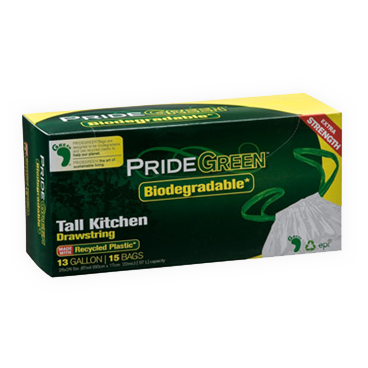 In the most used room in the house you want a trash bag that is not only up to the challenge, you want a bag that does not add to the challenge we face with the health of our environment. Introducing PrideGreen's Biodegradable 13 Gallon Drawstring Tall kitchen bag made with recycled plastic.